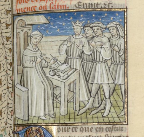 Parigi, Bibliothèque interuniversitaire Sainte-Geneviève, 1128, f. 105r. Giovanni Boccaccio incontra un gruppo di sfortunati.