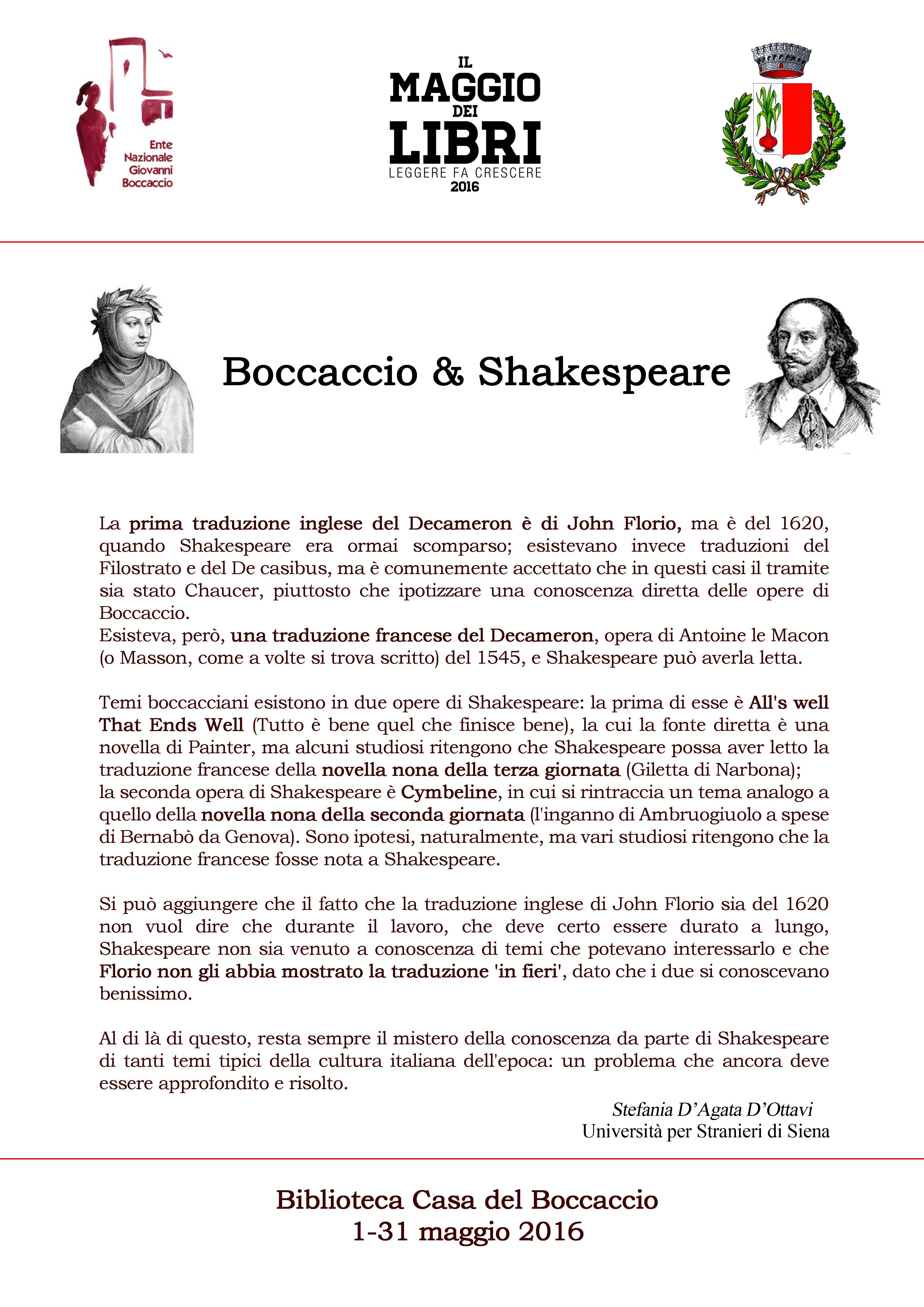 Boccaccio & Shakespeare 1 - 31 maggio 2016 Boccaccio & Shakespeare Esposizione in occasione della campagna nazionale di promozione della lettura "Il maggio dei libri" In orario di apertura del museo