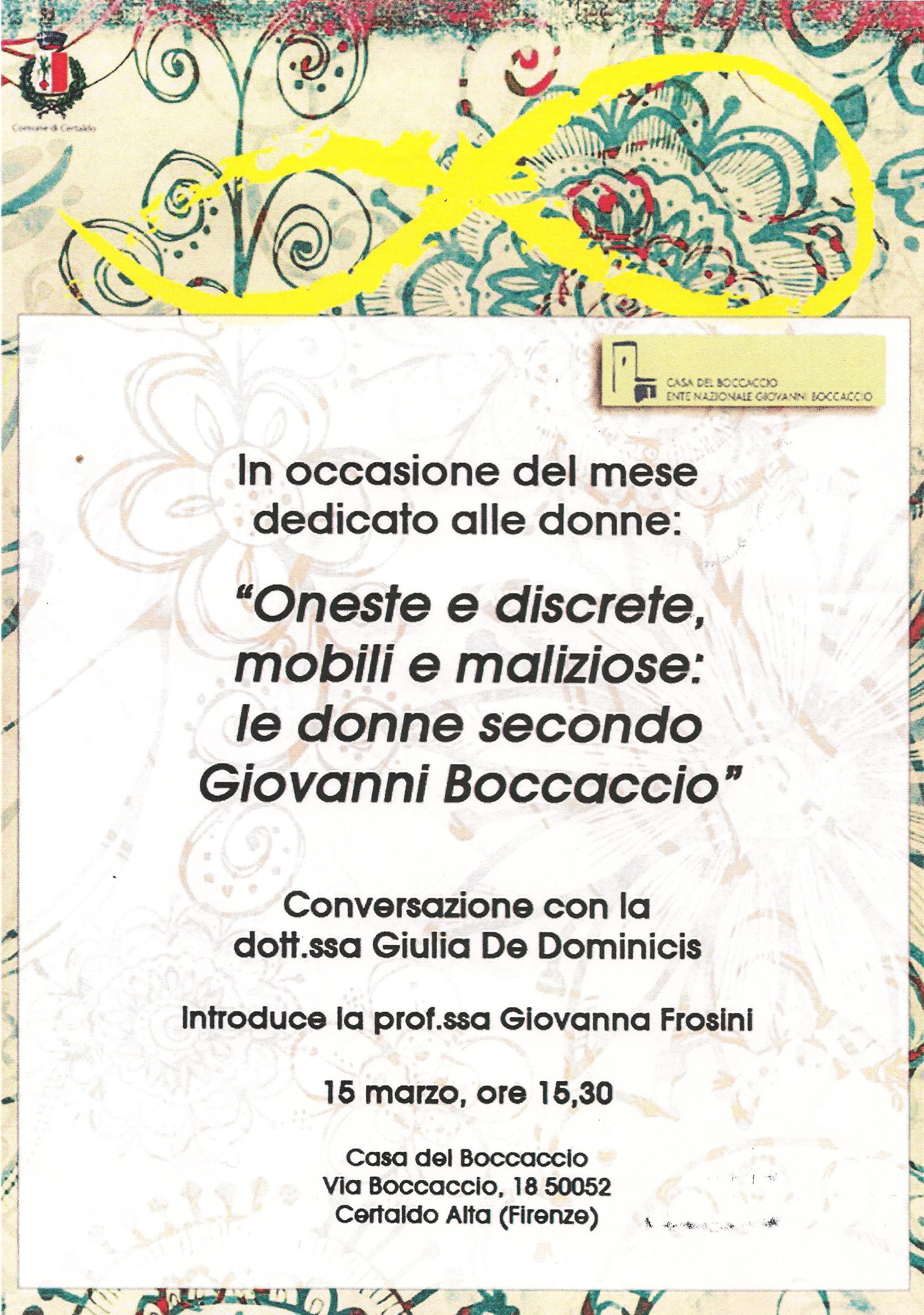 Oneste e discrete, mobili e maliziose: le donne secondo Giovanni Boccaccio 15 marzo 2013 ore 15,30 Oneste e discrete, mobili e maliziose: le donne secondo Giovanni Boccaccio Conversazione con la dott.ssa Giulia De Dominicis Ingresso libero