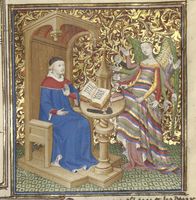 Parigi, Bibliothèque Nationale de France, Fr. 131, f. 7r. Adamo ed Eva compaiono dinanzi all'autore Giovanni Boccaccio, seduto dinanzi ad un leggio.