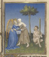 Parigi, Bibliothèque de l'Arsenal, 5193, f. 229r. La Fortuna, raffigurata come una regina bendata e alata con dodici braccia, appare a Giovanni Boccaccio seduto nel suo studio.