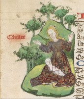 Londra, British Library, Harley 1766, f. 230v. La duchessa Romilda consegna le chiavi di Cividale al re degli Avari.
